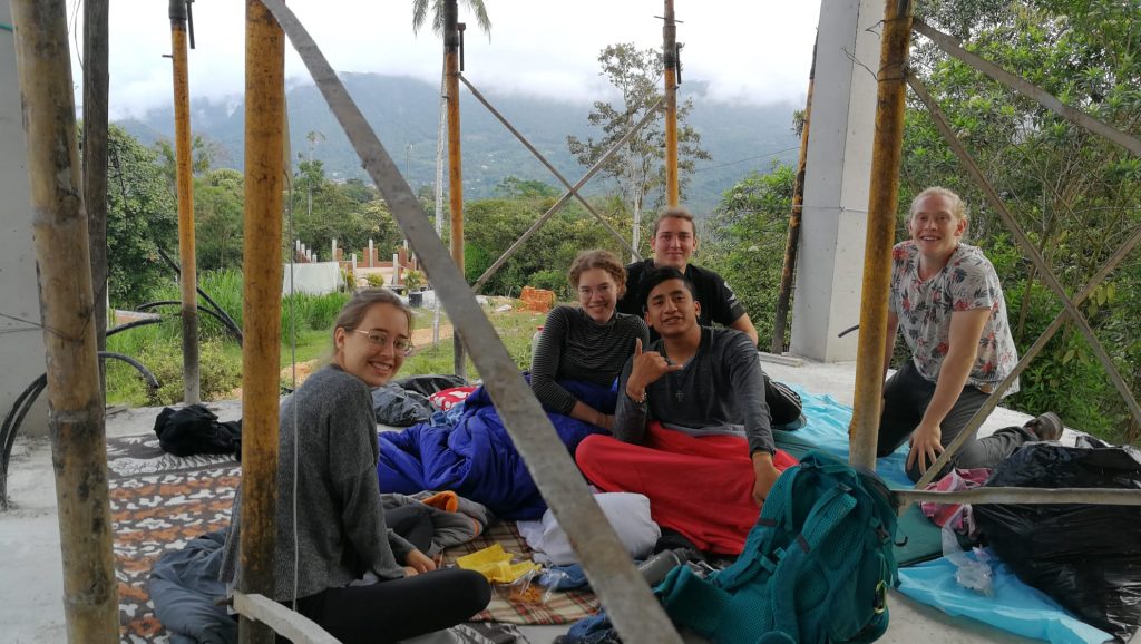 Was mich aufweckt sind Moskitos. Eine ganze Wolke schwebt über meinem Kopf und will mich stechen. Dass die hier oben so arg sind hätten wir nicht gedacht, aber klugerweise liegt das Insektenmittel trotzdem griffbereit. Schlafsack über den Kopf und geht schon. Die schöne Aussicht, mit der wir Aufwachen wollten, wird von Wolken verdeckt. Also weiterschlafen. Aber nicht lang, denn irgendwann rücken Baustellenarbeiter an. Und die anderen beschließen aufzustehen und Musik aufzudrehen, ungeachtet dessen, dass Edwin und ich eigentlich noch schlafen wollen. Naja. Dafür bringt Felix aber Frühstück herauf und die Ananas fungiert gleich als Stativ für ein verschlafenes Gruppenfoto.