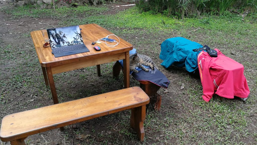 Das Wochenende verläuft relativ ruhig. Ich schreibe gefühlt 80 Blogbeiträge nach und weil die Sonne es ausnahmsweise mal gnädig mit uns meint verlege ich meine Oficina in den Garten. Dort trocknen sogar die Sachen, die gestern beim Motorradfahren nass geworden sind und die Katze findets super. Ein Bilderbuchtag.