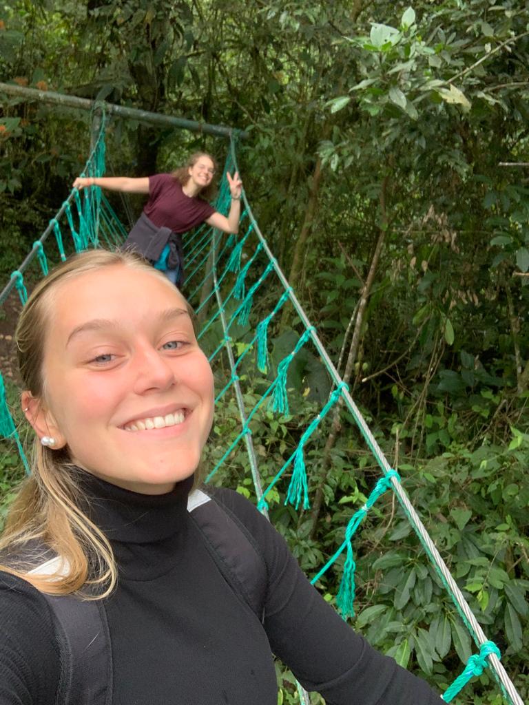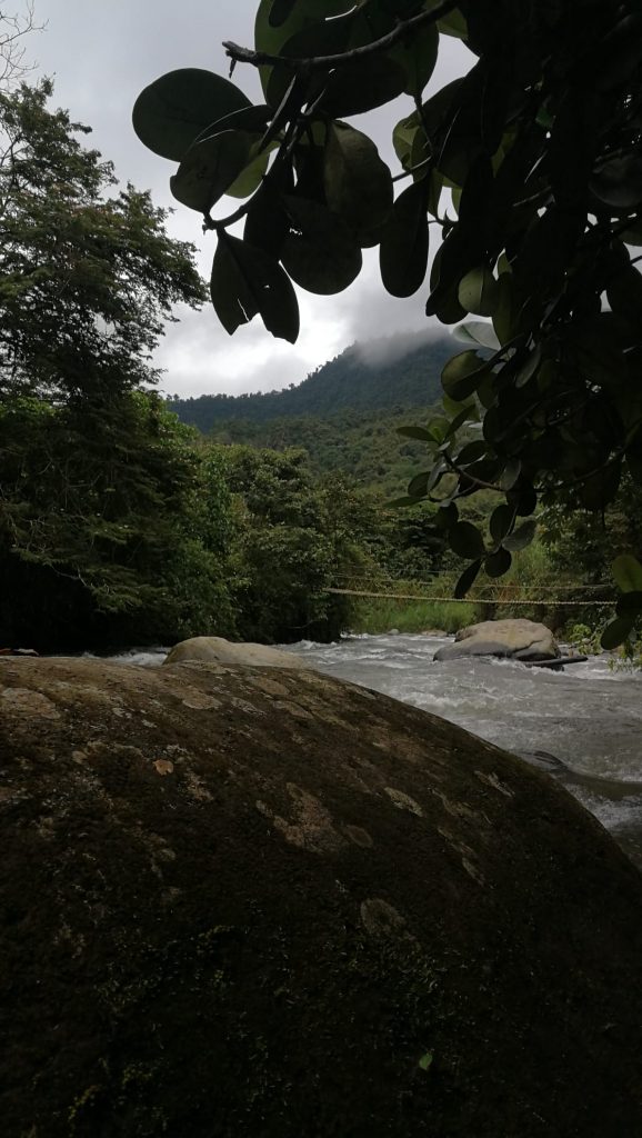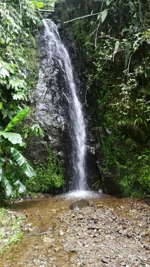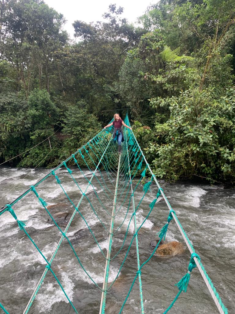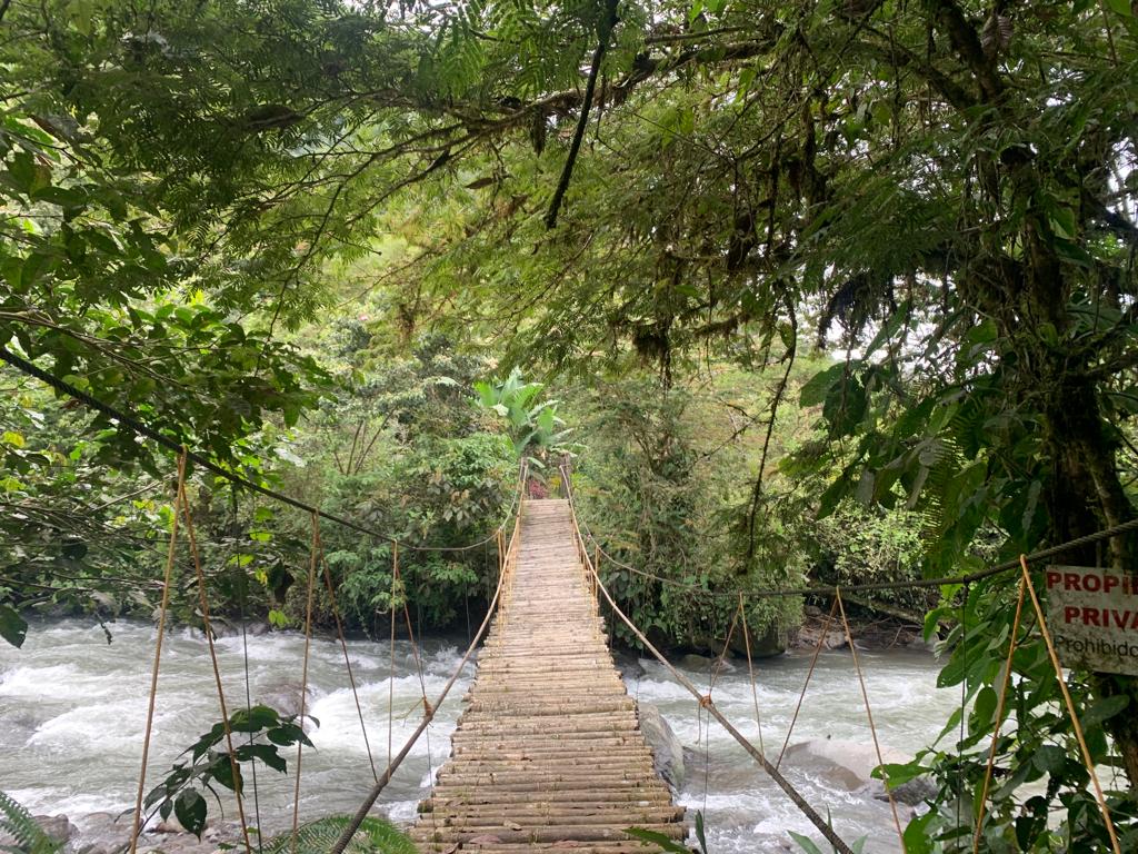 Maja und ich beschließen außerdem, auf unsere Art in den „Concurso de malas ideas“, den Dummheitenwettbewerb einzusteigen. Dazu gehört dann zum Beispiel, dass wir uns spontan gemeinsam mit Eva ein Helix-Piercing stechen lassen oder einen kleinen Ausflug über eine wackelige Hängebrücke unternehmen, von der wir nicht wissen wem sie gehört. Aber wir entdecken ein superschönes Stückchen grün mit Waldwegen, Wasserfall und Bächlein. Und die Gummistiefel zahlen sich wieder mal aus.
