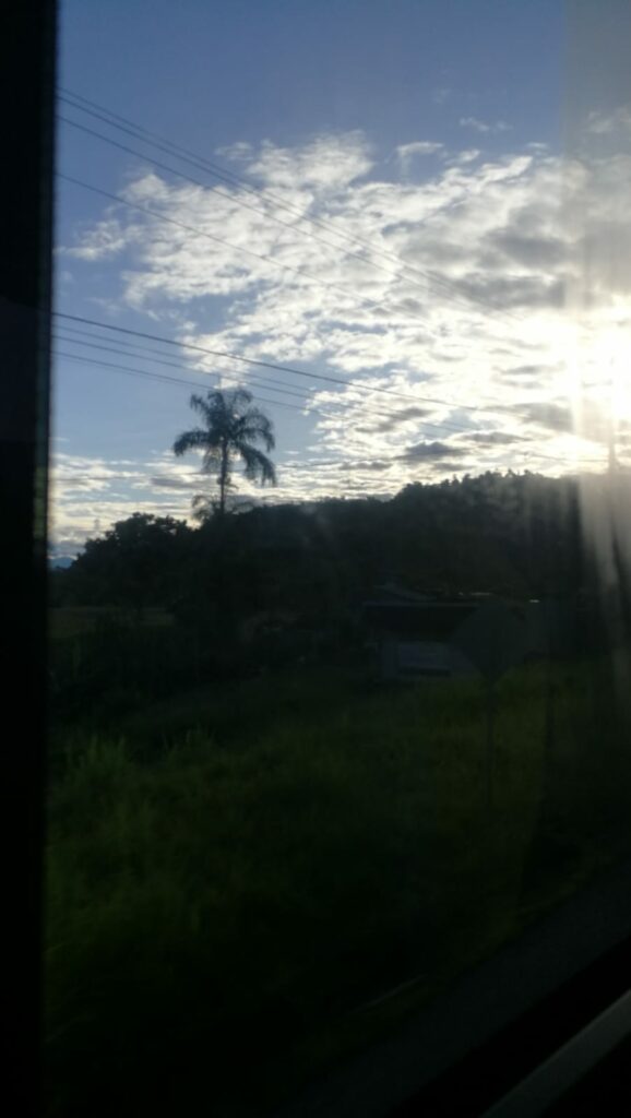 Mein Ohr knackst, wir überwinden ordentlich Höhenmeter. Von Handyempfang immer noch keine Spur. Es wird finster im Bus, links und rechts ragen Berghänge auf. Neben der Straße stürzen auch Wassermassen zu Boden. Sie machen das grün ganz nass und sammeln sich in einem kleinen Bach. Die Straße bleibt für heute halbwegs trocken. Aber die Natur hat Kraft. Sie könnte ohne weiteres die Ganze Straße unter Wasser und Schlamm setzen und dafür sorgen, dass kein einziger Bus mehr durchkommt. Aber heute nicht. Bergauf, dann eine Kurve. Die Sonne senkt sich gerade über den Bergen und strahlt noch mit der letzten Kraft des Tages. Die Handykamera weigert sich, dass Naturschauspiel einzufangen.