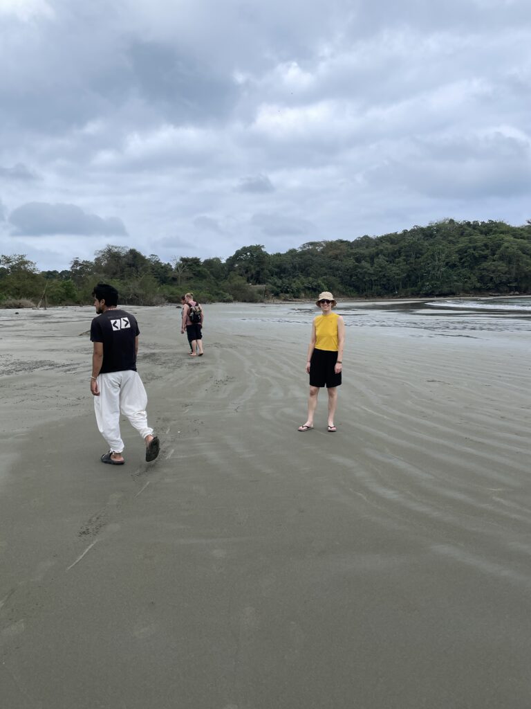 Am Playa Negra genießen wir aber erst einmal den Strand mit dem schwarzen Sand, der weicher ist als alles, was meine Füße bisher gespürt haben. Julia und ich versuchen eine Sandburg zu bauen, aber der Versuch findet bald ein Ende, weil es wichtigeres gibt: Talis findet einen ewig langen Baumstamm, dessen ein Ende ausschaut wie ein Drachenkopf. Den Drachen müssen wir jetzt alle einmal reiten und habens lustig damit. Danach reiten wir alle noch die Wellen, die nochmal höher sind als am Tag davor auf Portete. Edwin und Talis versuchen sich behelfsmäßig ein Holzstück als Surfboard zu verwenden, währenddessen jagt Annika die Hunde über den Strand, bis die ko in den Sand fallen. Es ist gemütlich da, besonders weil außer uns sechs niemand auf dem Strandstück ist. Ich bin fasziniert von der Weite und der Freiheit, die sie mit sich bringt. Hier kann man rennen, sich herumjagen und sich mit Sand abschießen – alles egal, für alles ist Platz. Nach einer Weile sind wir alle müde und spazieren mitsamt den Hunden zurück nach Mompiche, wo Julia versucht mit Sandro die Übernachtung auf der Schildkrötenstation zu checken. Recht bald wird klar, dass das nichts werden wird – erst gegen 9 Uhr abends kommt das OK, dass wir kommen können. Das lassen wir aber, spielen stattdessen Karten und gehen ins Bett.