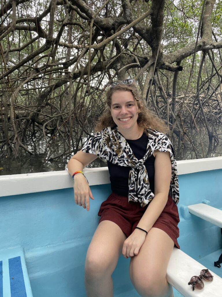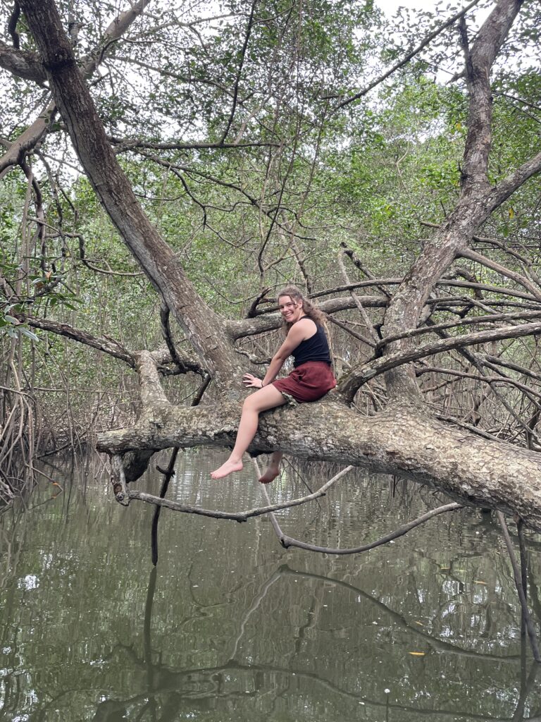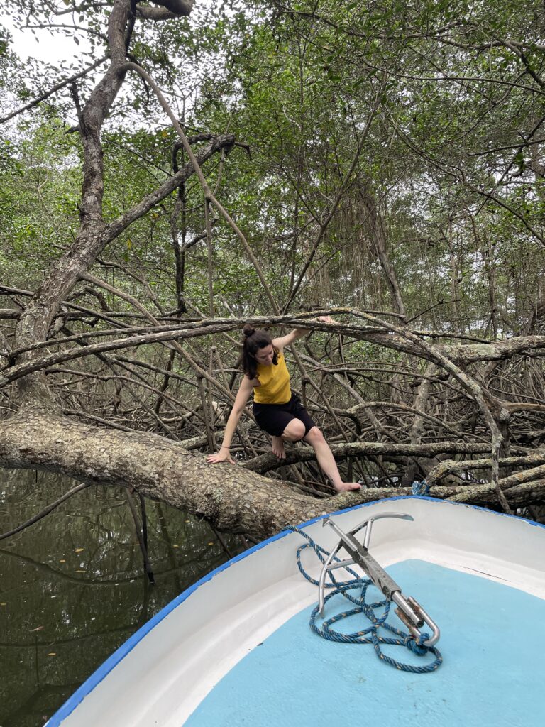 Dort findet sich recht schnell ein Typ der uns in die Mangrovenwälder hineinführt und einiges erzählt. Mangroven, lerne ich, sind Bäume die im Wasser wachsen. Drei verschiedene Arten wachsen hier zwischen dem Festland und der benachbarten Insel Portete. Es ist beeindruckend, wie das wilde Geflecht an Wurzeln sich durchs Wasser zieht. An einer Stelle dockt der Bootsfahret mit uns an und wir dürfen auf die Mangroven klettern. Wir haben Spaß und es landet auch niemand im Wasser, außer ein Ast, der dem Versuch sich daran anzuhalten, nicht standhält.