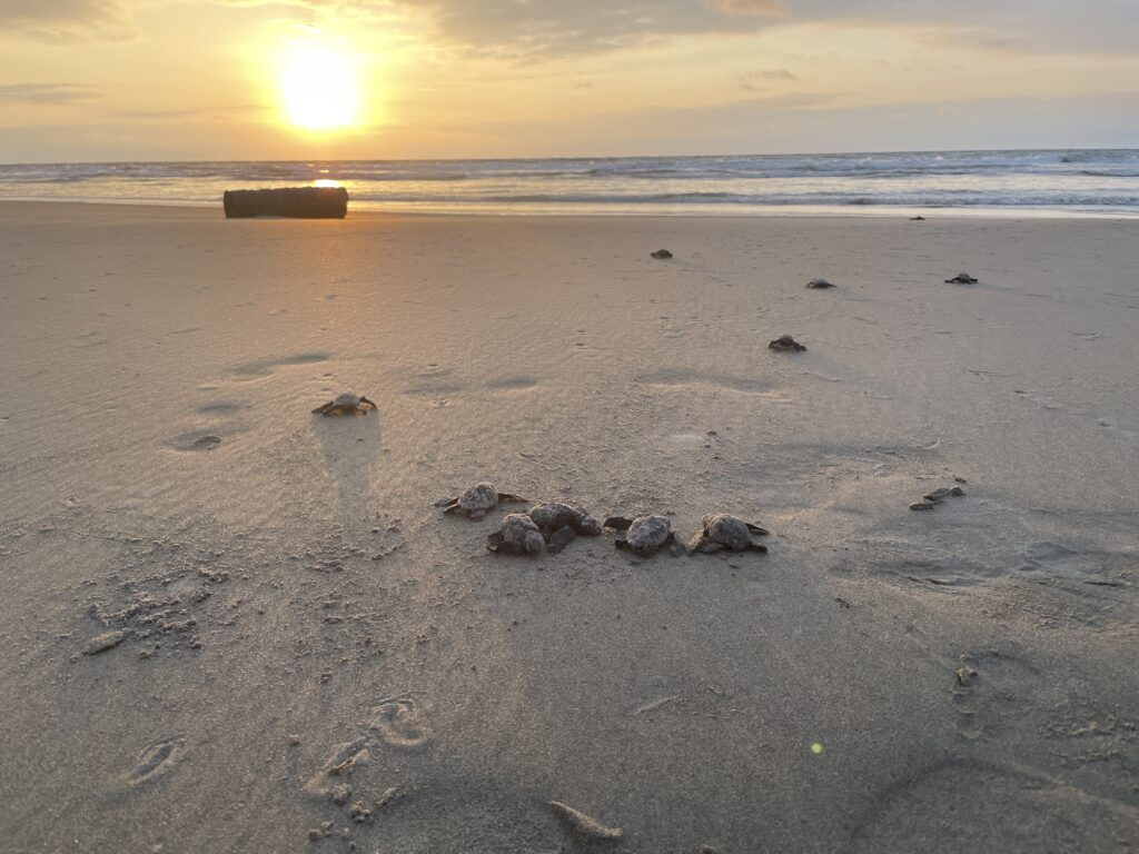 Und er verrät uns, dass ein paar Meter den Strand runter noch ein paar Babys grad zum Wasser krabbeln. Wir lassen alles stehen und liegen und laufen los, das müssen wir sehen. Und da sind sie: 15 bis 20 kleine Schildkröten, die sich durch den Sand kämpfen. Im orangenen Licht vom Sonnenuntergang sind sie wie schwarze Punkte im Sand. Wir fieber extrem mit, wie sie es mühsam zur Wassergrenze schaffen. Ein paar schnelle werden von den ausgehenden Wellen ein Stück ins Wasser gezogen, die nächste Welle spült sie wieder an den Strand. Es ist kaum auszuhalten da zuzuschauen. Irgendwann ist Sandro auch wieder bei uns und meint, wir können sie ins Wasser setzen. Wir freuen uns so extrem, dass wir das dürfen. Jede einzelne Babyschildkröte heben wir vorsichtig hoch und setzen sie ins Wasser. Es braucht teilweise ein paar Anläufe, bis sie nicht mehr an Land gespült werden. Wir können kaum fassen, wie viel Glück wir haben, das beobachten zu dürfen.